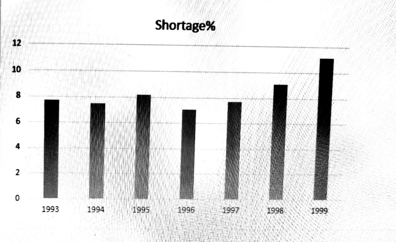 प्रश्न 9 –निम्नलिखित तालिका 1993-1999 तक भारत में कुल बिजली की कमी को दर्शाती है। डेटा को ग्राफ़ के रूप में दिखाएँ। Y-अक्ष पर वर्षों और X-अक्ष पर वर्ष के लिए प्लॉट की कमी का प्रतिशत।